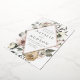 Elegantes invitaciones florales de bodas de invierno con detalles bodas mostrados en letras verdes oscuras enclavadas dentro de un marco de Relieve metalizado de oro floral y rosa. Las flores de invierno tienen una paleta de colores de rosa polvoriento, rosa claro, marfil y amarillo dorado suave con hojas de eucalipto y follaje de invierno en tonos verde sabio y verde bosque rico.