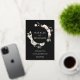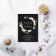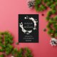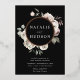 Elegantes invitaciones de bodas florales de invierno con sus nombres rodeados por una corona de Relieve metalizado dorado rosa con flores acuarelas y follaje sobre un fondo negro. Las flores de invierno tienen una paleta de colores de rosa polvoriento, rosa claro, marfil y amarillo dorado suave con hojas de eucalipto y follaje de invierno en tonos verde sabio y verde bosque rico.