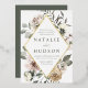 Elegantes invitaciones florales de bodas de invierno con detalles bodas mostrados en letras verdes oscuras enclavadas dentro de un marco de Relieve metalizado floral y dorado. Las flores de invierno tienen una paleta de colores de rosa polvoriento, rosa claro, marfil y amarillo dorado suave con hojas de eucalipto y follaje de invierno en tonos verde sabio y verde bosque rico.