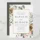 Elegantes invitaciones florales de bodas de invierno con detalles bodas mostrados en letras verdes oscuras enclavadas dentro de un marco de Relieve metalizado dorado floral y rectangular. Las flores de invierno tienen una paleta de colores de rosa polvoriento, rosa claro, marfil y amarillo dorado suave con hojas de eucalipto y follaje de invierno en tonos verde sabio y verde bosque rico.