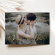 Elegante y elegante guardar la tarjeta de fecha con su foto de compromiso horizontal con "Save The Date" mostrada en un guión moderno de Relieve metalizado dorado. Personalice el Relieve metalizado dorado para guardar la tarjeta de fecha añadiendo sus nombres, fecha de boda y ciudad/estado de su sede boda. El lado inverso de la tarjeta tiene un fondo verde sabio.