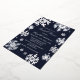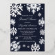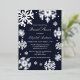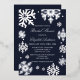 Invitación a la ducha de novia con fondo azul marino con copos de nieve gris y blanco plateado