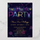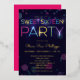 Dulce Dieciséis invitaciones partidistas en morado oscuro con letras de neón brillantes y frases de bokeh y Relieve metalizado dorado. Perfecto para un resplandor en la noche con temática oscura.