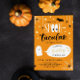 Invitación de cumpleaños de Halloween adorable con Espeluznante escrito en una combinación de fuentes divertidas, las dobles oes en espeluznante diseñadas para parecer ojos grandes. El texto está rodeado de estrellas doradas, arañas y un murciélago. Y un fantasma adorable dice a sus invitados el nombre y la edad del niño que cumple años. La parte trasera presenta rayas a juego en negro, blanco y naranja.