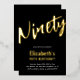 Añada estilo y lujo a sus celebraciones de cumpleaños con estas elegantes invitaciones de cumpleaños de Relieve metalizado de oro. El diseño presenta el guión de caligrafía 'Ninety' en oro sobre un fondo negro clásico con una plantilla de personalizado moderna que se puede personalizar fácilmente con sus propios detalles del evento. El nombre y la edad también están en Relieve metalizado dorado.