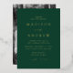 Invitación minimalista y moderna a la boda con los detalles de su boda en letras de Relieve metalizado dorado con acentos caligráficos. El fondo verde puede cambiarse a un color de su elección. La parte posterior de la invitación a la boda del Relieve metalizado muestra su foto de compromiso vertical. Diseñado para coordinar con nuestra colección de bodas Modern Elegance.