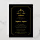 A libra legal scales of justice and scalloped frame gold foil and black graduation party invitation design that can be personalized for law or other legal field school graduations. Composite design by Holiday Hearts Designs (rights reserved).