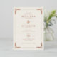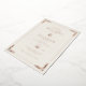 This elegant wedding invitation features a classic rectangular layout with a vertical orientation, centered text, and decorative floral motifs in the corners. The soft cream background is complemented by gold accents, creating a sophisticated and warm atmosphere. The design incorporates ornate flourishes and botanical elements that frame the central text, enhancing its theme of celebration and elegance. With a mix of serif fonts, it balances formality and readability, making it perfect for a refined wedding event.