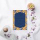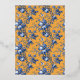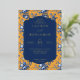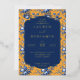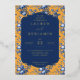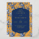 This elegant wedding invitation features a vibrant mustard yellow background adorned with intricate blue floral patterns, creating a romantic and classic aesthetic. The central navy-blue frame with gold outlines highlights the customizable text areas, allowing for personalization of names, dates, and locations in a sophisticated serif font. The design exudes a vintage charm, perfect for formal celebrations, while the warm color palette and detailed illustrations evoke a sense of sophistication and joy. Ideal for couples seeking a timeless and visually appealing invitation to mark their special day.