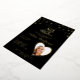 Crea una elegante invitación de cumpleaños número 50 de negro y dorado con una foto en forma de corazón (por favor, use la plantilla para subir su foto antes de ordenar). La plantilla de texto facilita la personalización de las invitaciones con sus datos, como su nombre, fecha del evento, dirección del lugar y datos de RSVP. También puede cambiar el hito a 30, 40, 60, etc. El fondo negro es de un color sólido en estas tarjetas. El foil real está en la parte frontal de la tarjeta.