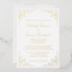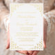 Esta elegante invitación a la boda formal inspirada en la cosecha de vintage presenta el texto en escritura de Relieve metalizado de oro real y fuentes serif, enmarcado por un delicado motivo de vid de oro de época.