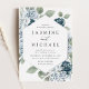 Elegantes invitaciones florales para bodas con detalles bodas rodeados de un marco geométrico de Relieve metalizado plateado con polvorientas rosas azules y blancas, hortensias, y exuberantes hojas y vegetación de eucalipto. ¡Esta polvorienta invitación a una boda floral azul es perfecta para tu boda de primavera o verano!