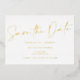 Moderno y elegante guión de Relieve metalizado de oro real en boda blanca salve la fecha con una caligrafía informal y genial de escritura, agrega tu foto al fondo