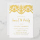 Invite a su invitado a su evento con este Relieve metalizado de personalizable dorado sellado dulce invitación de 16 fiestas. Cuenta con un elegante encaje botánico brocado y una caligrafía caprichosa. Personalice esta elegante y dulce invitación de dieciséis partidos añadiendo nombres, fecha, hora, lugar y otros detalles. Esta invitación al Relieve metalizado dorado es perfecta para cualquier tema de cumpleaños.