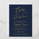Elegante invitación de fiesta de cumpleaños 75 azul oscuro con "75 & Fabulous" en un guión de caligrafía de moda y los detalles fiestas en letras modernas y sencillas, todo representado en su elección de genuino Relieve metalizado de oro, plata o rosa.