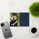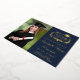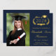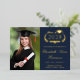 Moderna invitación a una fiesta de graduación universitaria de color azul oscuro con un verdadero Relieve metalizado de oro, "Clase de" en un ilustracion de corona de laurel que incorpora un topper de grad y diploma, una foto del graduado y su nombre en un guión elegante. Añada su escuela, su escuela principal, honores o planes futuros. En la parte posterior, añada los detalles del fiesta de grado en una tipografía simple de oro claro.
