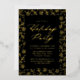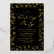 Elegante invitación de fiesta vacacional con un borde de copos de nieve de Relieve metalizado dorado y ramas de pino sobre un fondo negro. "Fiesta de vacaciones" se muestra en un guión de caligrafía de Relieve metalizado dorado con los detalles de su fiesta que se muestran a continuación. La invitación a la fiesta de las copas de nieve se revierte para mostrar un hermoso patrón de copos de nieve.