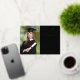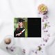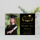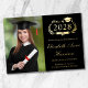 Moderna invitación de graduación universitaria negra con Relieve metalizado real, "Clase de" en un ilustracion de laurel que incorpora un topper de grad y diploma, una foto del graduado y su nombre en un guión elegante. Añada su escuela, su escuela principal, honores o planes futuros.