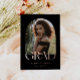 Un elegante diseño de boho en negro con "GRAD" en Relieve metalizado rosa le añade un toque de glamour y sofisticación a sus anuncios de graduación, elevándolos a unos pasteles dignos de ser exhibidos. Las opciones de personalizable incluyen Relieve metalizado de oro y plata. Un mensaje personalizado a los seres queridos está en el reverso para incluir tus logros que reflejan la brillantez de tu viaje a través de la secundaria.
