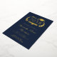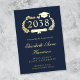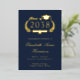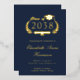 Invitación formal de graduación universitaria azul con su elección de oro real, Relieve metalizado de oro plateado o rosa, "Clase de" en una corona de laurel que incorpora un topper de grad y diploma y el nombre del graduado en un guión elegante. Añada su escuela, especialidad, honores o planes futuros en la tipografía clásica del serif.
