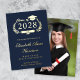 Invitación formal de graduación universitaria de color azul oscuro con Relieve metalizado genuino (elegir entre Relieve metalizado de oro oro, plata o rosa), "Clase de" en un ilustracion de una corona de laurel que incorpora un topper y diploma de grad y el nombre del graduado en un guión elegante. Añada su escuela, su escuela principal, honores o planes futuros. Su foto llena la parte trasera de la tarjeta.