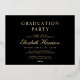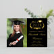 Moderna invitación de graduación universitaria negra e invitación de fiesta con "Clase de" dentro de una corona de laurel, una gorra de graduación y un diploma, una foto del graduado y su nombre, escuela, especialidad, honores o planes futuros en un elegante Relieve metalizado de oro real. Al revés, añada los detalles del fiesta.