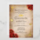 Crea tus propias y elegantes invitaciones de quinceañera roja acentuadas en Relieve metalizado de oro real (también disponible en oro plateado y rosa). El vintage arte floral de Raphaela Wilson representa dramáticos rosas de color rojo oscuro de color agua, confeti de mariposa brillante, un vestido de fibra / viste el borde, y una corona real de princesa / tiara. Mantenga el fondo del papel de pergamino de desplazamiento antiguo o agregue su propia textura o imagen. Si quieres incluir tu propia imagen en la parte de atrás, como una glamorosa foto de Mis Quince Anos, es tan fácil como subir tu propia imagen. Estas invitaciones de papel de pergamino de lujo se pueden reformular para complementar a bodas rojos y dorados, una princesa mexicana de cuento de hadas con dulce de 16 años, una ducha real para un chica, una ducha nupcial alguna vez, u otras ocasiones especiales y únicas. Siéntase libre de cambiar el guión de caligrafía negra y los tipos de letra modernos a otro estilo tipográfico de su elección, personalizando aún más el diseño floral en estas invitaciones personalizadas de plantilla DIY. ¡Disfrútalo! Categoría: invitaciones de boda rojas vintage, invitaciones personalizadas de membrillo con mariposas/flores, y papel de papel pergamino personalizado con Relieve metalizado de oro real. Los colores de la fiesta son rojo y dorado: burdeos, rojo oscuro, marrón, marsala, marsala, marrón claro, dorado, negro y blanco.