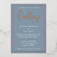 Estas elegantes y modernas invitaciones nupciales cuentan con un bonito diseño de Relieve metalizado dorado sobre un polvoriento fondo azul. Los detalles del boda se imprimen en un tipo de letra sofisticado y se acentúan con un borde de oro subió. "El boda de" está impreso en un hermoso tipo de letra de guión.