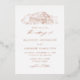Invitaciones rústicas de boda con un ilustracion de Relieve metalizado de oro rosa esbozado de un granero mostrado en la parte superior de la invitación sobre un fondo blanco. Las invitaciones a bodas de granero presentan elegantes elementos de caligrafía de Relieve metalizado de oro rosa a lo largo de todo el diseño. Personaliza las invitaciones a la boda de rosa de Relieve metalizado dorado con tus nombres y detalles de boda.