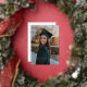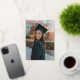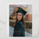 Una elegante invitación al Relieve metalizado dorado de graduación de fotos con escritura simple, foto de retrato de sangre completa en el frente con nombre, escuela y clase del año. La parte trasera tiene "Celebremos" con el nombre del graduado y detalles de la fiesta de graduación.