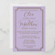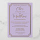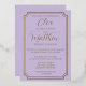 Elegante invitación de boda atemporal de lila y lavanda con escritura dorada y letras en serif dentro de un marco