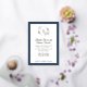 Sencillo, elegante y moderno diseño de invitación a la ducha de Relieve metalizado dorado con un rico borde azul marino y un lado inverso, sus iniciales de monograma y su texto de invitación. Este diseño fue creado a partir del diseño de la corona de hojas dibujadas a mano para un marco monográfico contemporáneo con una caligrafía Ampersand. Diseñado de forma gráfica por la artista y diseñadora con licencia internacional Audrey Jeanne Roberts, copyright.