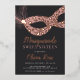 Elegantes invitaciones de baile de máscaras para tu dulce celebración de dieciséis años, con una máscara ornamental en un polvoriento Relieve metalizado de oro rosa rosa y rosa, adornado con una pluma. Personalice los detalles de su fiesta Sweet 16 debajo de la escritura caligráfica y de la inscripción en bloques.