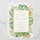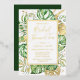 Esta elegante invitación a la fiesta de té de la ducha tropical con nubes incluye palma verde y dorada, philodendron y hojas de helecho. Un elegante marco de Relieve metalizado dorado resalta el texto del Relieve metalizado dorado. Las salpicaduras de Relieve metalizado dorado acentúan este diseño botánico exótico y le aportan un poco de sofisticado capricho a la invitación. Este oasis de la isla es perfecto para tomar un té de luau, playa o ducha de novia con temática tropical.