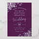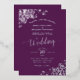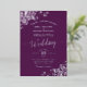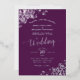 Esta hermosa invitación a la boda incluye la impresión real de Relieve metalizado en un fondo de color púrpura de ciruela. El bonito diseño tiene caligrafía de escritura plateada de encaje con filigree floral de encaje en las esquinas. Elegante, elegante, sofisticado y moda, esta invitación es elegante y de buen gusto.