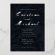 Elegante invitación a la boda azul oscuro de la marina, con un adorno floral ornamental vintage. Guión de la pareja boda en Relieve metalizado plateado.