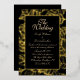El Relieve metalizado dorado deja sobre un elegante fondo negro. Elegante tema de Boda gótico oscuro estético. Esta tarjeta se puede editar fácilmente con su texto personal.