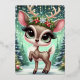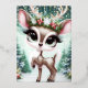 This magical baby reindeer stands gracefully in a sparkling winter wonderland, framed by glowing Christmas trees and shimmering lights. With her big sparkling eyes, soft brown fur, and festive wreath crown, she brings a touch of holiday magic to the snowy forest. A perfect blend of cute, cozy, and Christmas charm!