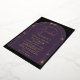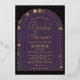 Una moderna y elegante plantilla de invitación a la ducha de novias con un tema celeste, lunar y estrellas, tarot, adivino, con un doble marco de arco de boho dorado y elementos celestes: el sol, la luna, el cáliz, constelaciones, estrellas... en un esquema de color púrpura, negro y dorado. Los verdaderos acentos de Relieve metalizado oro elevan esta invitación a un asunto elegante. Un bonito espacio, universo, horóscopo, zodiac, celestial temática de ducha de novia diseño para una novia moderna.