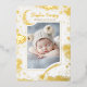 El blanco celeste y el oro (un verdadero Relieve metalizado dorado) tarjeta de foto de anuncio de nacimiento, rebosante de magia encantadora. La preciosa foto de tu pequeña, enclavada en una escena soñadora y celestial, con una luna resplandeciente, constelaciones brillantes y una estrella fugaz, que simbolizan un deseo que se hizo realidad.