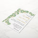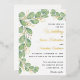 Estas invitaciones florales a la boda con la vegetación eucaliptus acuarela y el texto negro y dorado sobre fondo blanco son elegantes y únicos. El texto de la plantilla facilita la personalización. El follaje botánico decora la parte delantera y trasera de las invitaciones a la boda.