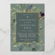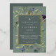 La invitación botánica de moda para bautizos, bautizos o dedicaciones para bebés presenta un borde de hojas botánicas verdes de sabio exuberante y follaje eucalipto de color agua con guarnecido de Relieve metalizado dorado. Personaliza con tu ceremonia y detalles fiestas con letras modernas en un tono de fondo verde musgo.