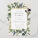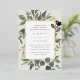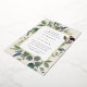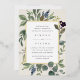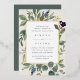 La elegante invitación botánica a la boda enmarca los detalles de la celebración de su boda con un borde de hojas de eucalipto de color agua, flores azules y follaje verde. El Relieve metalizado de oro de lujo completa el diseño.