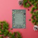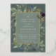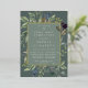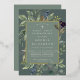 La primera invitación botánica a la comunión sagrada a la moda incluye un borde de hojas botánicas verdes de sabio exuberante y un follaje eucalipto de color agua con guarnecido de Relieve metalizado dorado. Personaliza con tu ceremonia y detalles fiestas con letras modernas en un tono de fondo verde musgo.