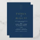 This gold foil wedding invitation from the Everly Collection features a refined art deco design in deep navy blue with crisp white typography and elegant line accents. The editorial layout and geometric details set a classic, modern, retro mood.