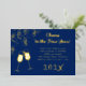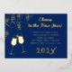Invitación a la fiesta de Año Nuevo de Relieve metalizado con confeti festivo cayendo y diseño de lentes de afinado. Tarjetas de plantilla horizontales, azul oscuro, con el texto "Saludos al año nuevo" en los números de arriba y de año a lo largo de la parte inferior. En el medio, texto personalizar con información fiesta. Todos los términos, números y elementos de diseño en el frente son Relieve metalizado, en oro, plata o oro rosa. El reverso contiene un patrón confetti.