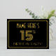 La fachada de esta invitación inspirada en el estilo de los años 1920-1930, inspirada en la celebración de Relieves metalizados de 15 años, incluye un nombre personalizado, un gran número inspirado en el estilo Art Déco "15TH", el mensaje "¡PARTIDO DE CUMPLEAÑOS!" y un patrón fronterizo compuesto de líneas. El fondo del frente es negro de color de forma predeterminada, pero se puede personalizar a un color diferente si se desea. La parte posterior incluye detalles personalizados sobre el evento, como la fecha, hora, ubicación y cualquier otra información relevante. Invitaciones lujosas, elegantes y editables como estas podrían ser usadas para invitar a los invitados a una celebración/fiesta de cumpleaños que se lleva a cabo en celebración del 15 cumpleaños de alguien. [~Z0000590]