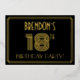 La fachada de este estilo vintage y de los años 1920-1930 inspirada en la invitación al Relieve metalizado de celebración de los dieciocho años incluye un nombre de personalizable, un gran estilo Art Déco inspirado en el número "18", el mensaje "¡PARTIDO DE CUMPLEAÑOS!" y un patrón fronterizo compuesto de líneas. Hay un fondo de color negro en el frente de forma predeterminada, pero se puede personalizar a un color diferente si se desea. La parte posterior incluye detalles personalizados sobre el evento, como la fecha, hora, ubicación y cualquier otra información que pueda ser relevante. Invitaciones lujosas, elegantes y personalizadas como estas podrían ser usadas para invitar a los invitados a una celebración/fiesta de cumpleaños que se realiza para honrar el 18 cumpleaños de alguien. [~Z0000590]