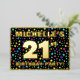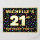 La parte delantera de este vibrante diseño de tarjetas de invitación para Relieves metalizados de cumpleaños 21 incluye un nombre personalizado, un gran número "21", el mensaje "¡FIESTA DE CUMPLEAÑOS!" y un borde. El fondo del frente tiene un patrón de estrellas colorido y emocionante. En la parte posterior se incluyen detalles personalizados sobre el evento, como la fecha, hora, lugar/lugar y cualquier otra información importante. Las invitaciones a personalizables como estas pueden ser una manera divertida de invitar a asistentes/invitados a una fiesta de cumpleaños que se lleva a cabo en celebración del cumpleaños 21 de alguien. [~Z0000600]