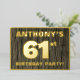 La parte delantera de esta audaz tarjeta de invitación para Relieve metalizado de cumpleaños sesenta y un cumpleaños incluye un nombre editable, un gran número "61", el mensaje "¡FIESTA DE CUMPLEAÑOS!" y una frontera, todo en Relieve metalizado. En el fondo de la fachada se respira un estilo rústico y elegante, inspirado en los granos de madera. En la parte posterior se incluyen detalles personalizados sobre el evento, como la fecha, hora, lugar/ubicación y cualquier otra información relevante. Las invitaciones de personalizable como estas podrían ser usadas para invitar a invitados/asistentes a una fiesta de cumpleaños que se lleva a cabo en celebración del cumpleaños 61 de alguien. [~Z0000598]